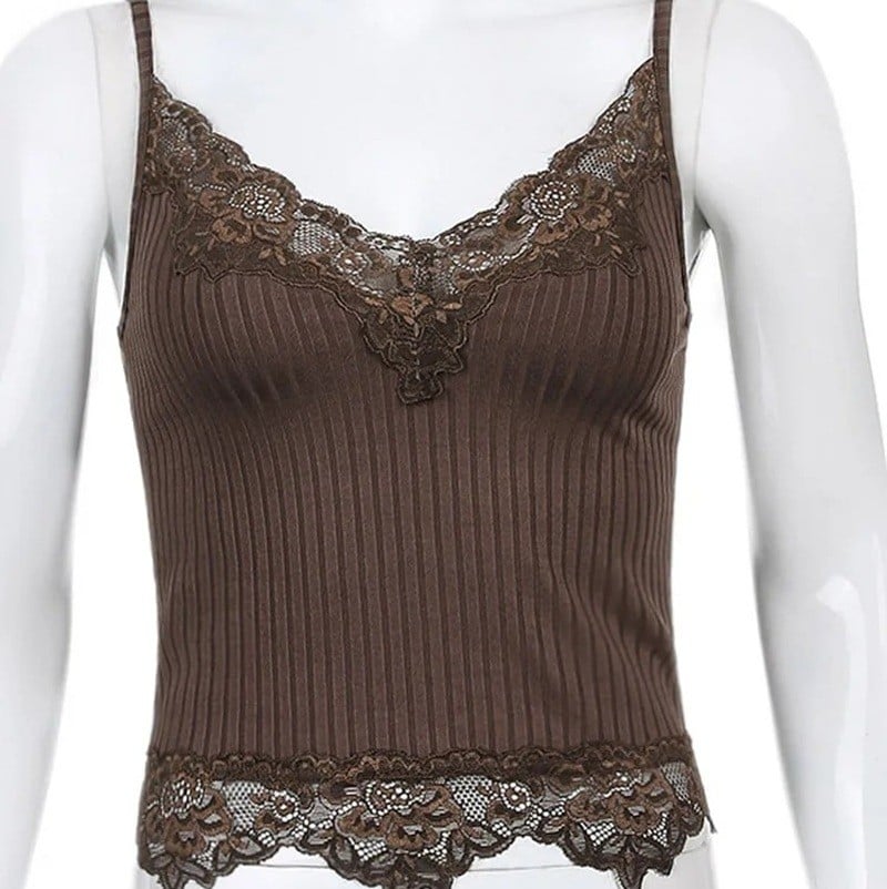 Débardeur en dentelle élégant avec décolleté en V et fines bretelles offrant un matériau en polyester léger et un look féminin pour les journées d'été. Description complète