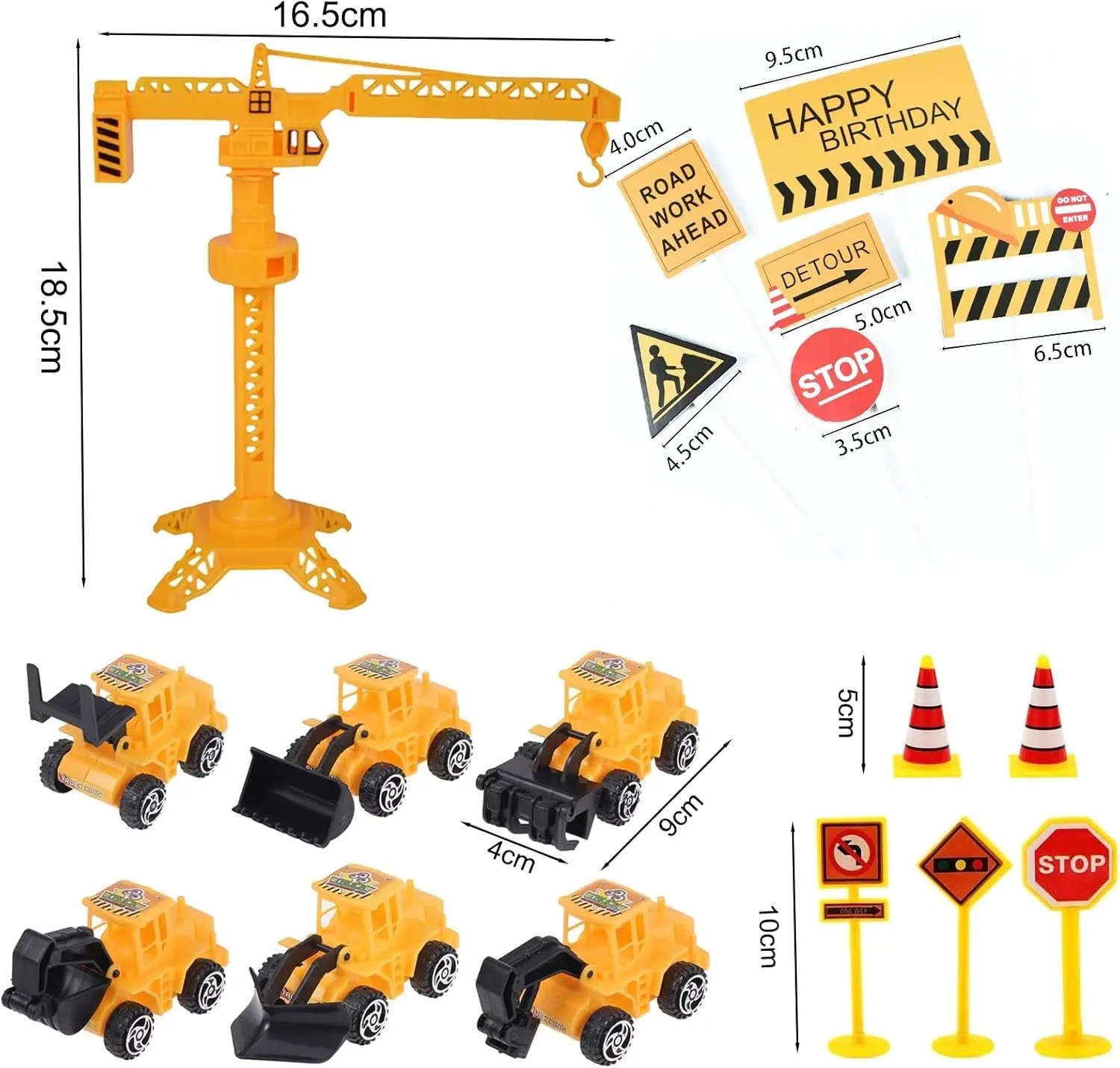 Les différentes décorations ont des tailles variées. Par exemple, les figurines de voitures de construction mesurent environ 9 cm de long, la grue mesure environ 18,5 cm de haut et certains panneaux de signalisation mesurent environ 10 cm de haut.