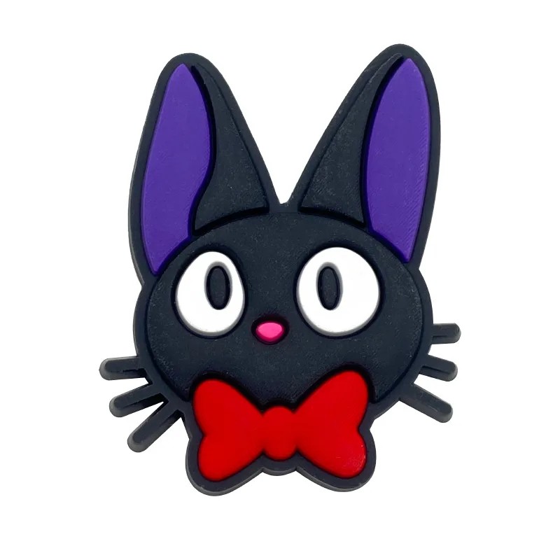La décoration pour crocs en forme de tête de chat avec un nœud est un accessoire intéressant pour modifier l'apparence des chaussures. Le motif frappant du chat avec des éléments colorés contrastants attire immédiatement l'attention et donne aux chaussures un style unique. La combinaison d'une base sombre avec des détails violets et un nœud rouge est à la fois marquante et claire.