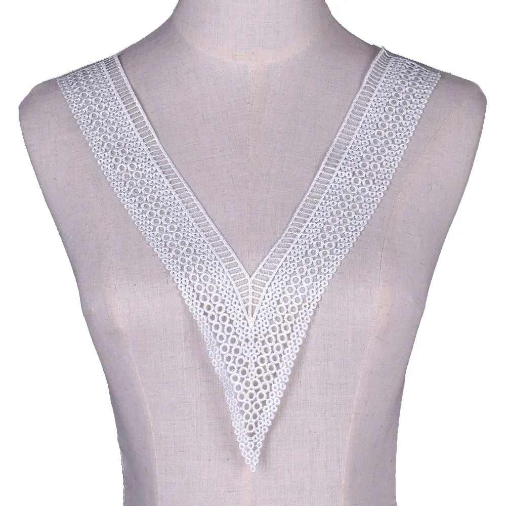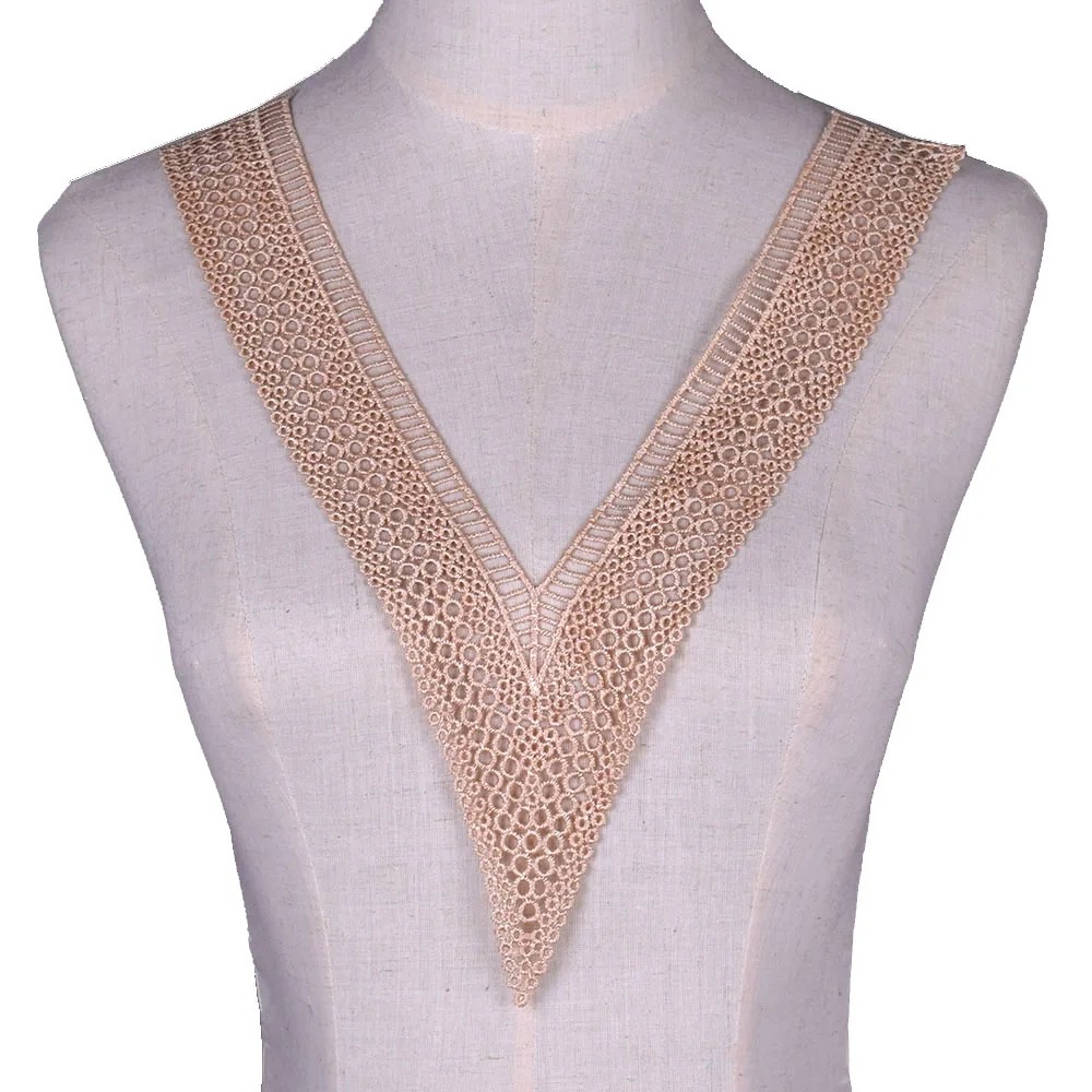 Le matériau est fabriqué en polyester de haute qualité, léger, durable et qui garde bien sa forme. Grâce à ses dimensions pratiques de 24 × 35 cm, elle offre suffisamment d'espace pour une décoration marquante du décolleté ou d'autres parties du vêtement. La forme en V élégante permet une couture facile et une adaptation à différents types de vêtements. Le motif en dentelle brodé apporte un aspect luxueux et délicat au tissu.