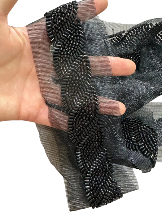 La dentelle perlée avec bord en tulle est un élément textile décoratif qui confère aux vêtements et aux accessoires textiles un aspect élégant et distinctif. Les perles délicates créent un détail attrayant qui met en valeur les bords des tissus et donne aux produits un caractère plus luxueux. Ce type de dentelle est particulièrement prisé pour la décoration de robes, de costumes ou de vêtements de fête.