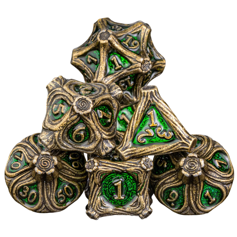 Ce set rustique de dés de jeu est conçu pour les jeux de société et de rôle avec un accent sur l'esthétique fantasy naturelle. Il contient 7 pièces de dés, qui forment une combinaison standard utilisée dans les systèmes RPG et les jeux comme Donjons et Dragons. Le motif de tribu et de racines inspiré de la nature donne aux dés un aspect brut et organique, soulignant l'atmosphère du monde de jeu.