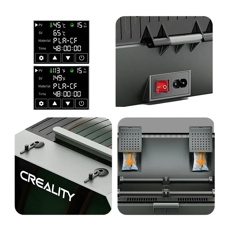 La boîte est également équipée de deux compartiments pour des absorbeurs d'humidité. Ceux-ci assurent le séchage même sans chauffage allumé, ce qui est approprié pour le stockage à long terme des filaments. La construction fermée avec un élément d'étanchéité empêche l'intrusion d'humidité extérieure, de sorte que les filaments restent secs même après une longue période sans utilisation. Le changement entre °C et °F, que vous connaissez d'autres appareils, est également présent ici, mais reste caché sans utiliser de mots étrangers.