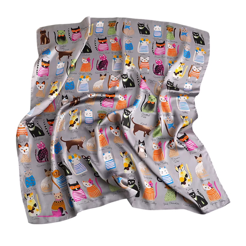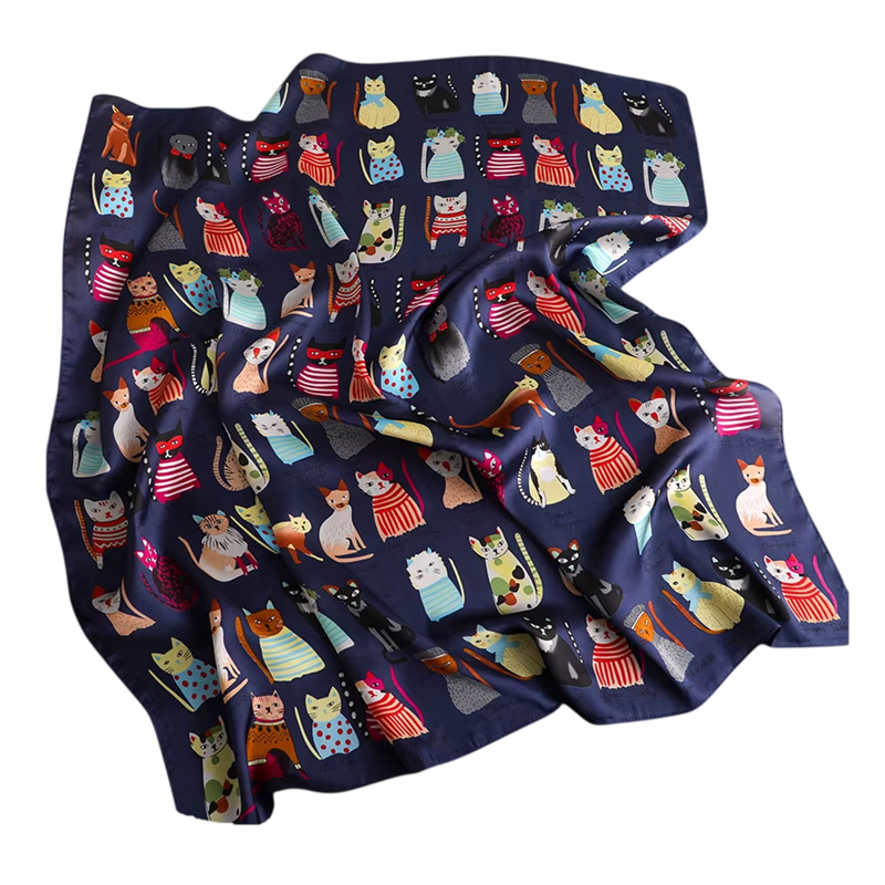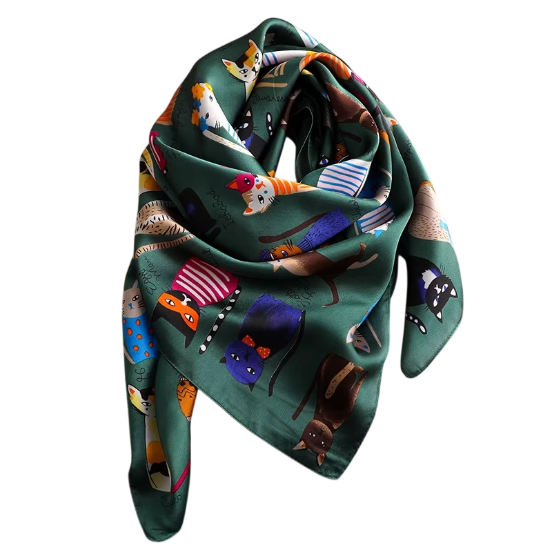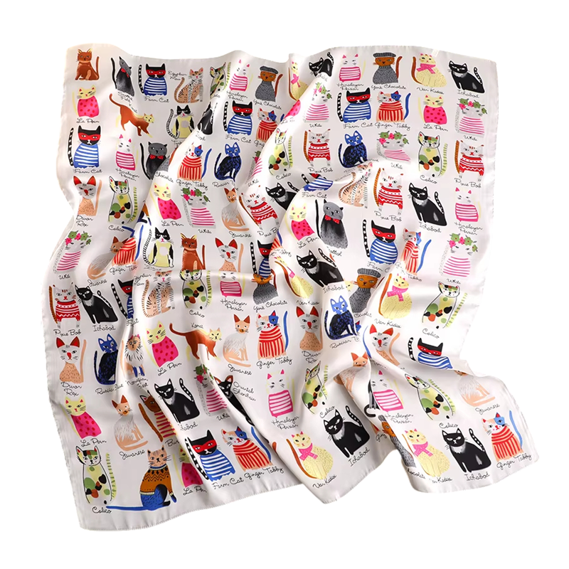 Foulard en satin élégant avec motif de chat, idéal pour le cou, les cheveux ou un sac. Accessoire léger d'été pour la plage et la ville. Description complète