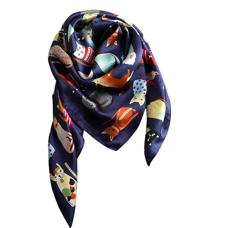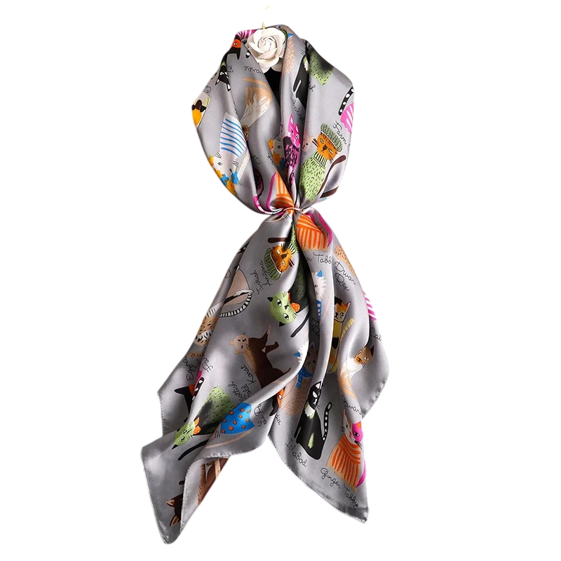 Écharpe carrée en soie d'été 90 x 90 cm Foulard en satin avec motif de chat pour femmes À porter autour du cou, dans les cheveux ou sur un sac Mode de plage