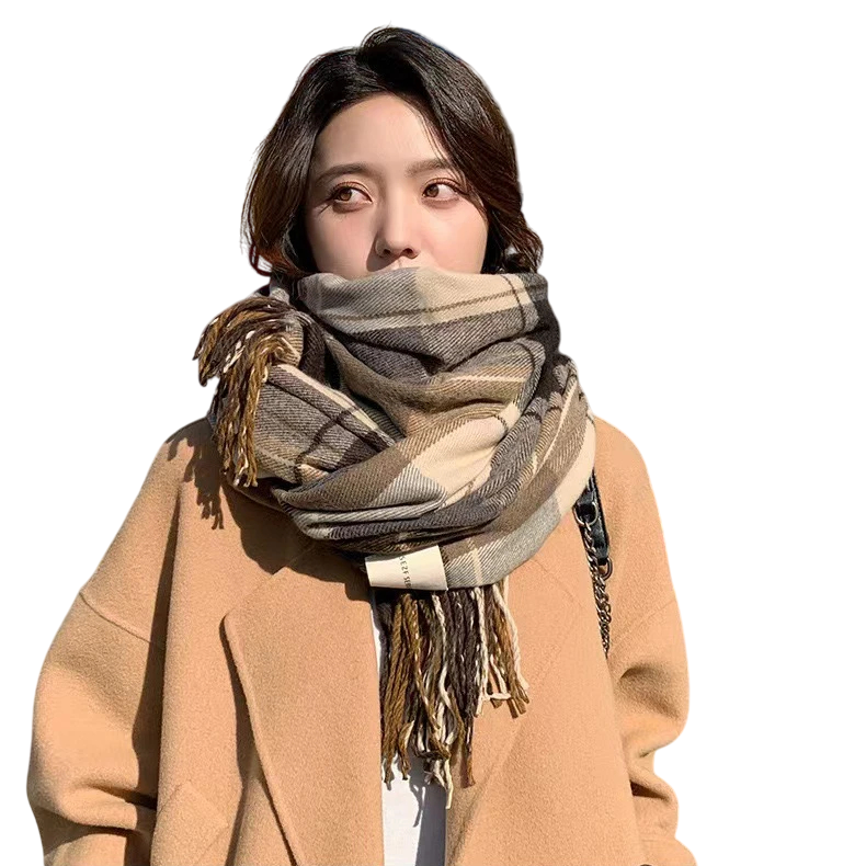 Écharpe en acrylique à carreaux pour femmes avec des franges. Chaude, douce et stylée, idéale pour un port quotidien en automne et en hiver et facile à assortir avec des tenues. Description complète