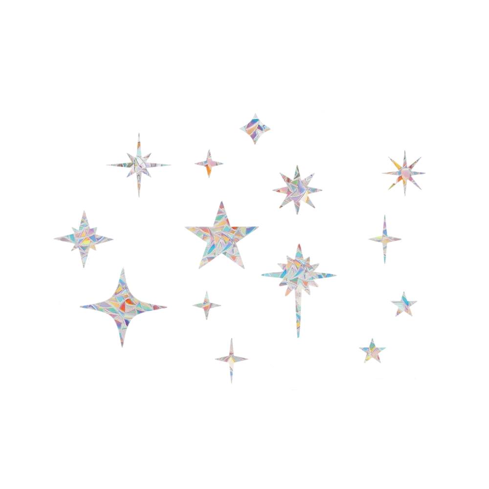 Autocollants décoratifs d'étoiles en PVC avec effet holographique arc-en-ciel illuminent les fenêtres et l'intérieur avec des reflets colorés lors de l'impact de la lumière. Description complète