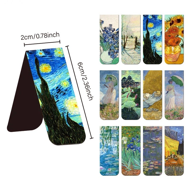 L'ensemble de douze marque-pages pliables offre une collection soigneusement sélectionnée de motifs inspirés par les peintures les plus célèbres de Vincent van Gogh. Chaque marque-page capture le style caractéristique de l'auteur – des coups de pinceau expressifs, un mouvement dynamique des couleurs et une forte atmosphère de paysages, de nature et de la vie quotidienne. Grâce à son format 6 x 2 cm, les marque-pages sont compacts, tiennent bien sur la page et offrent suffisamment d'espace pour afficher les détails des différentes peintures. La forme pliable permet une utilisation facile sans endommager les pages et aide à retrouver rapidement l'endroit où l'on s'est arrêté.