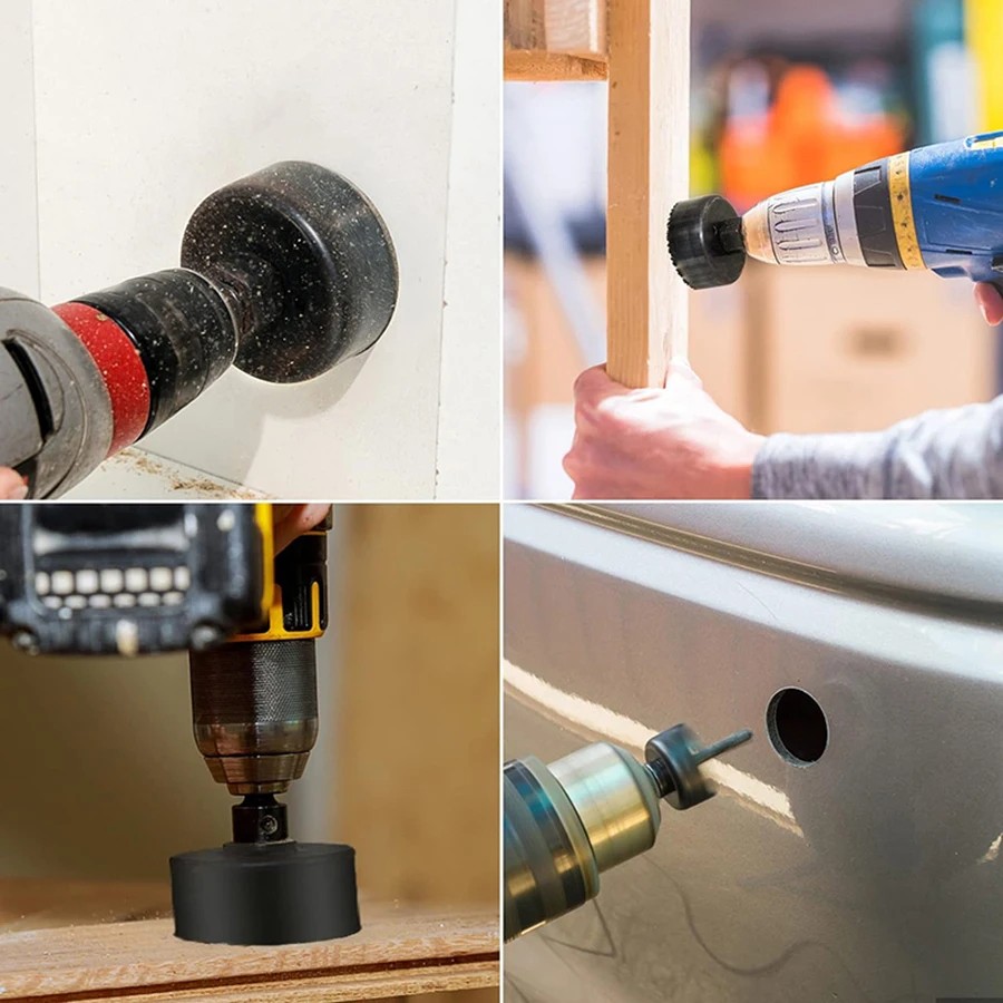 - Mode d'emploi : marquez le centre du trou, choisissez le bon diamètre, fixez le perforateur sur la tige, serrez, réglez des vitesses plus basses, percez perpendiculairement et en douceur ; après avoir traversé le matériau, libérez l'anneau découpé et nettoyez les dents