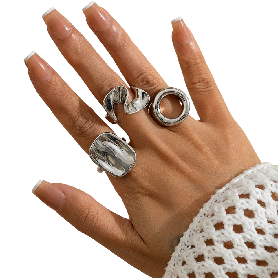 Ensemble élégant de bagues modernes avec surface lisse combinant formes géométriques et organiques. Accessoire idéal pour un port quotidien ou lors d'occasions spéciales. Description complète