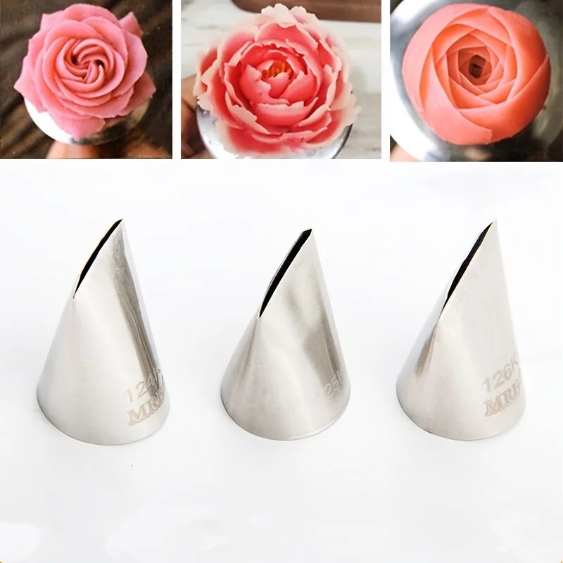 Les désignations 124K, 125K et 126K ne sont pas des dimensions, mais un code de type de forme couramment utilisé en pâtisserie. La douille 124K crée des pétales plus larges et des fleurs superposées adaptées aux grandes décorations. La douille 125K est idéale pour des pétales de largeur moyenne et marqués, par exemple pour les fleurs de pivoine. La douille 126K a une sortie plus étroite et permet de créer des pétales fins, précis et détaillés qui semblent très réalistes même à petite échelle. La combinaison de ces trois douilles élargit considérablement les possibilités de décoration et permet de créer des fleurs pleines de profondeur et de texture.