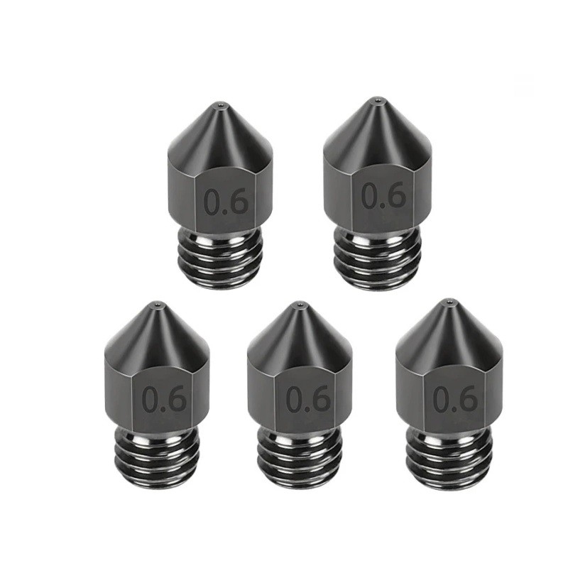 Ce jeu de buses est le choix idéal pour les utilisateurs qui recherchent un compromis entre la vitesse d'impression et des détails suffisants du modèle. L'orifice 0,6 mm permet d'imprimer des couches plus épaisses et une plus grande quantité de matériau en moins de temps, ce qui convient aux modèles plus volumineux et aux pièces fonctionnelles robustes. Les buses sont fabriquées en acier trempé, ce qui leur permet de résister à une utilisation prolongée et à des températures élevées. Le filetage M6 garantit un vissage facile sur la plupart des hotends courants destinés au filament 1,75 mm. L'ensemble de cinq pièces vous assure d'avoir toujours une buse de rechange prête à l'emploi lorsque nécessaire.