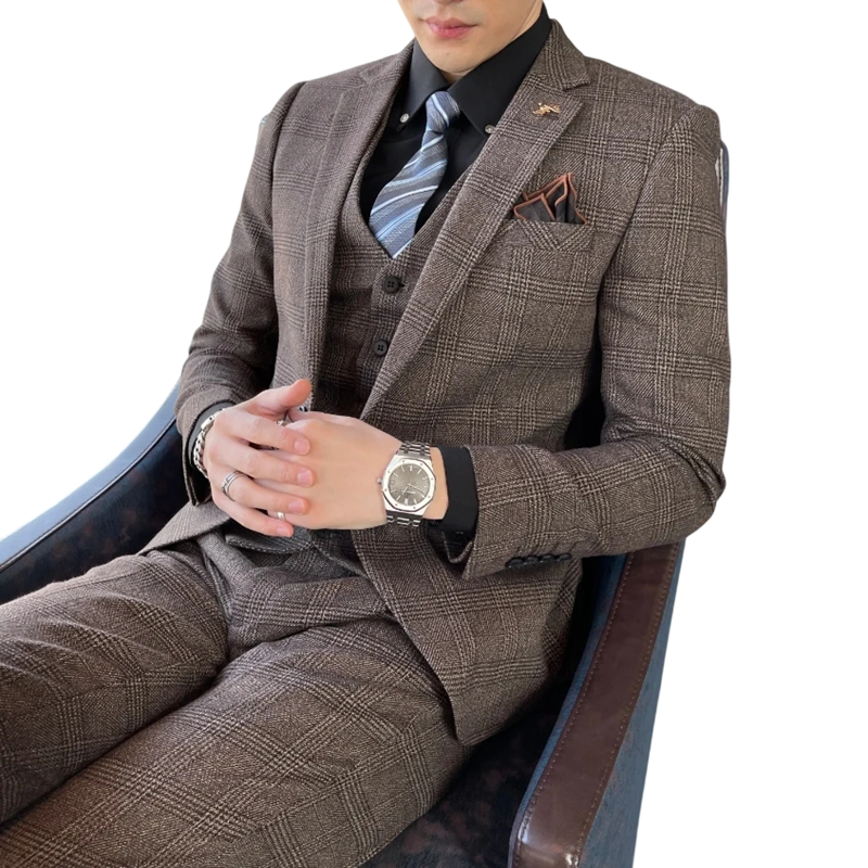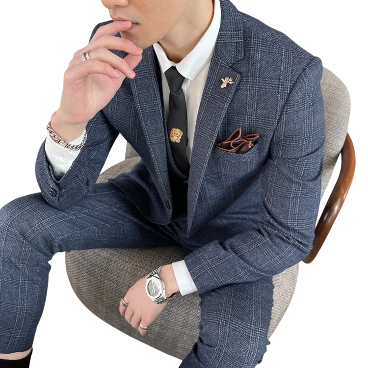 • Composition de l'ensemble : veste, gilet et pantalon dans le même design élégant.