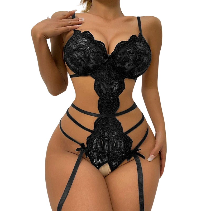 Ensemble de lingerie en dentelle pour femmes avec coupe connectée et jarretelles. Combinaison de polyester et nylon pour un confort optimal. Description complète