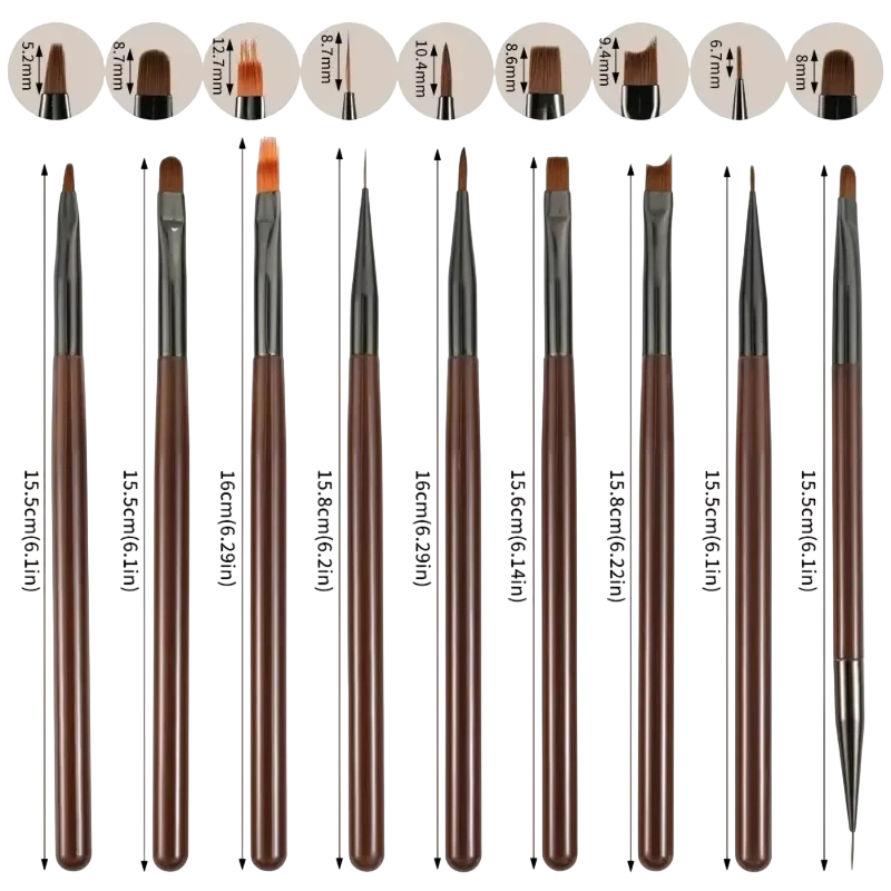 Ensemble de pinceaux à ongles marron de 9 pièces 15,5 - 16 cm, 5,2 - 12,7 mm, poils fins solides Cet ensemble de pinceaux à ongles de 9 pièces est idéal pour tous ceux qui se consacrent à la manucure et à l'art des ongles. Chaque pinceau a des