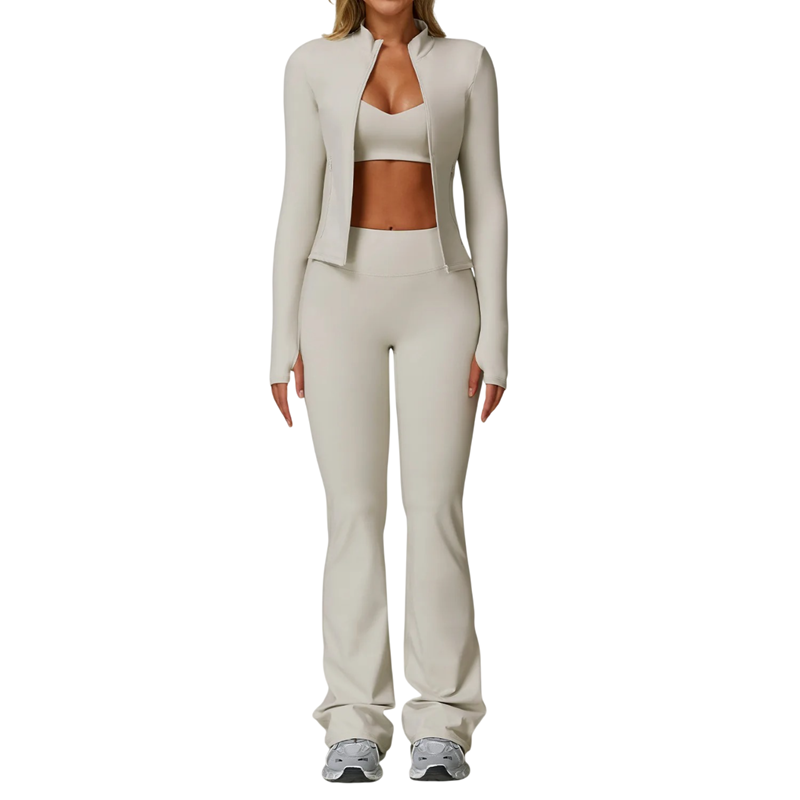 Ensemble de sport pour femmes avec pantalon, sweat à capuche zippé et soutien-gorge de sport en nylon et spandex. Design simple, idéal pour le fitness, l'exercice ou les loisirs, matériau confortable et élastique. Description complète