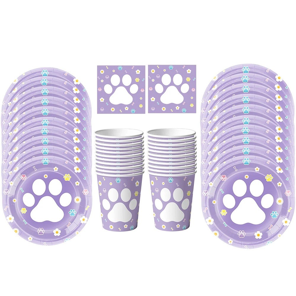 Ensemble de fête pratique avec un motif violet de pattes de chat comprenant des assiettes, des gobelets et des serviettes. Équipement idéal pour une fête d'anniversaire d'enfants stylée. Description complète