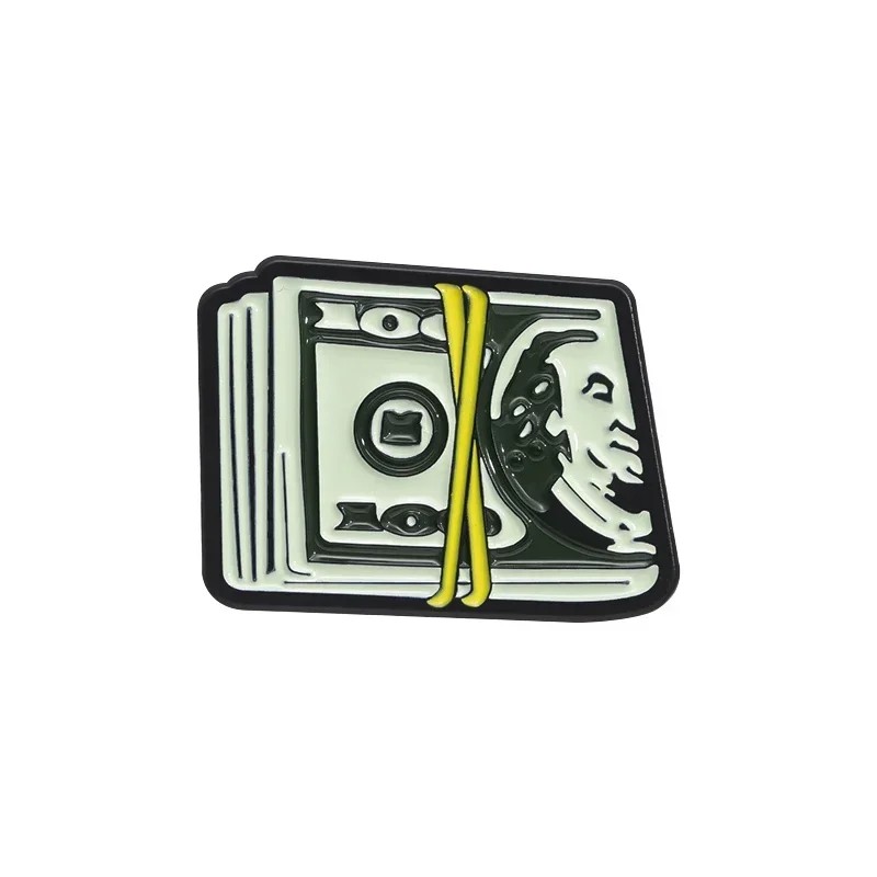Épinglette émaillée avec motif de billets de banque dans un design vert et noir. Insigne stylé avec motif d'argent adapté aux vêtements, revers et sac à dos. Description complète