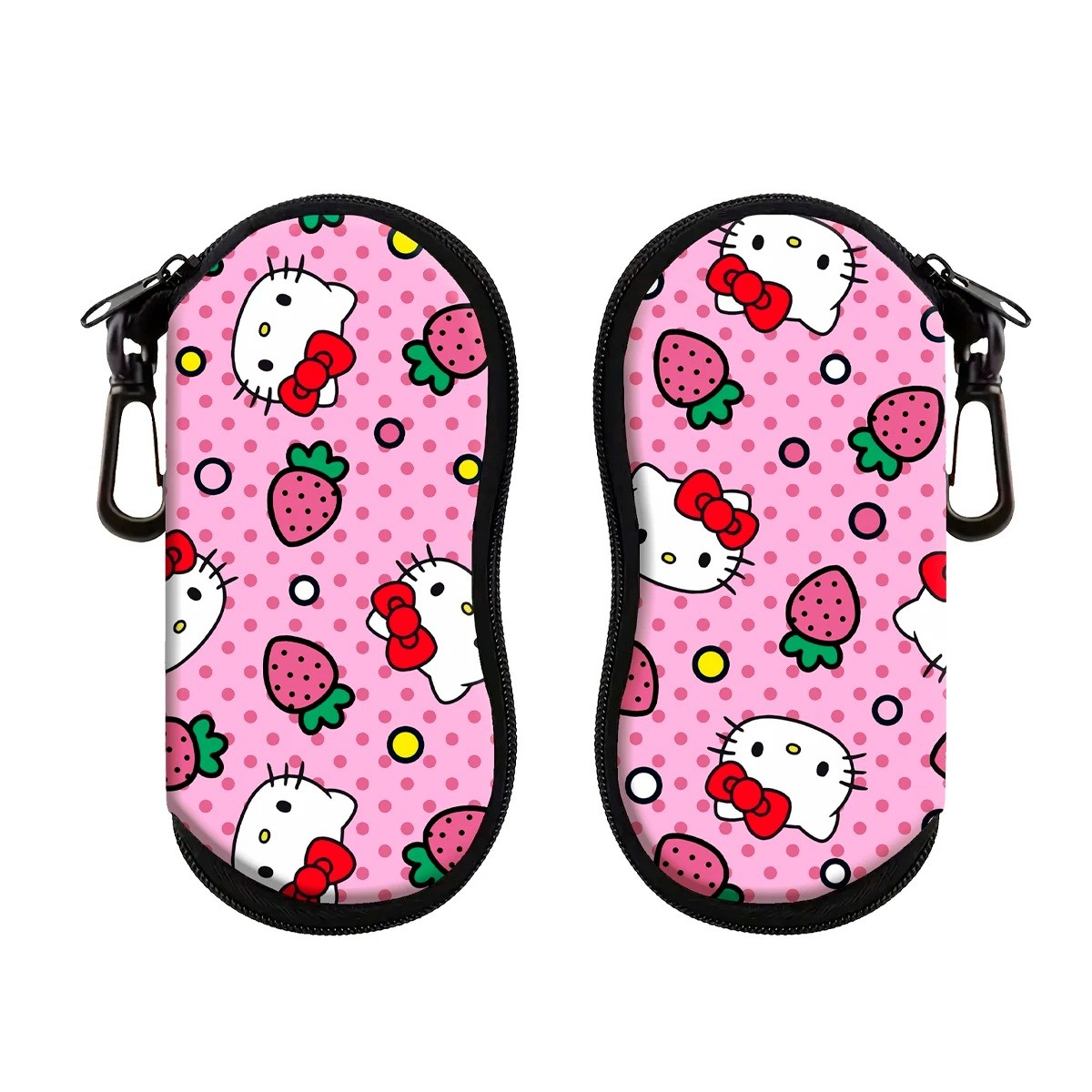 Étui à lunettes élégant avec motif chat blanc et fraise, fermeture zippée pratique et mousqueton pour le suspendre. Matériau léger et résistant. Description complète
