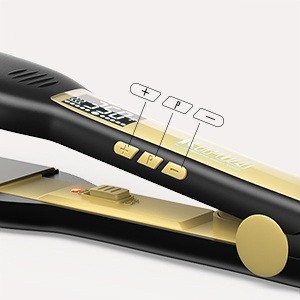 Grâce à un temps de préchauffage d'environ 30 secondes, l'appareil est prêt à l'emploi peu après son activation. La température peut être réglée sur une large plage de 80 à 230 °C à l'aide des boutons situés directement sur le corps du fer, la valeur actuelle étant clairement affichée sur un écran LCD numérique. La graduation fine de la température permet de choisir le réglage approprié pour des cheveux fragiles, colorés, abîmés ainsi que pour des cheveux épais et sains. La large surface de chauffage d'environ 1,75" (environ 45 mm) facilite le travail avec de plus grosses mèches et réduit le temps de coiffage.