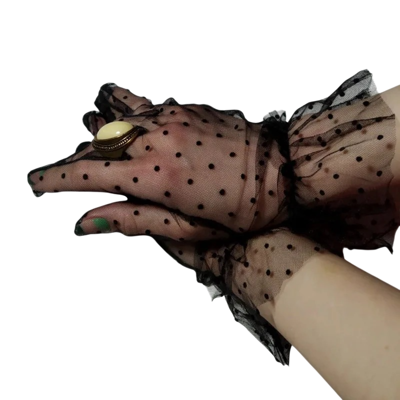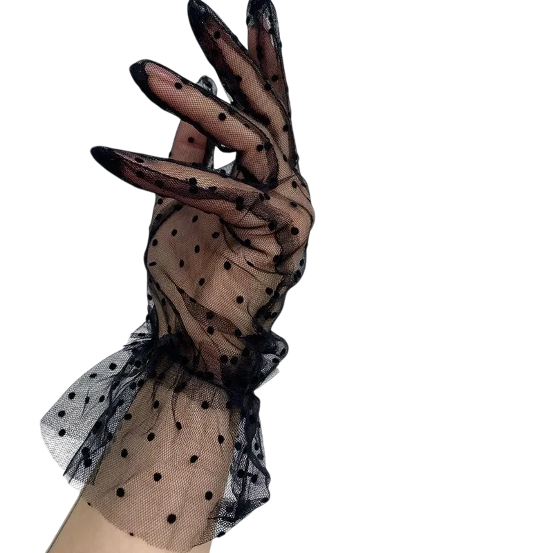Gants en dentelle pour femmes à doigts complets courts avec pois et fronces en polyester respirant pour occasions festives
