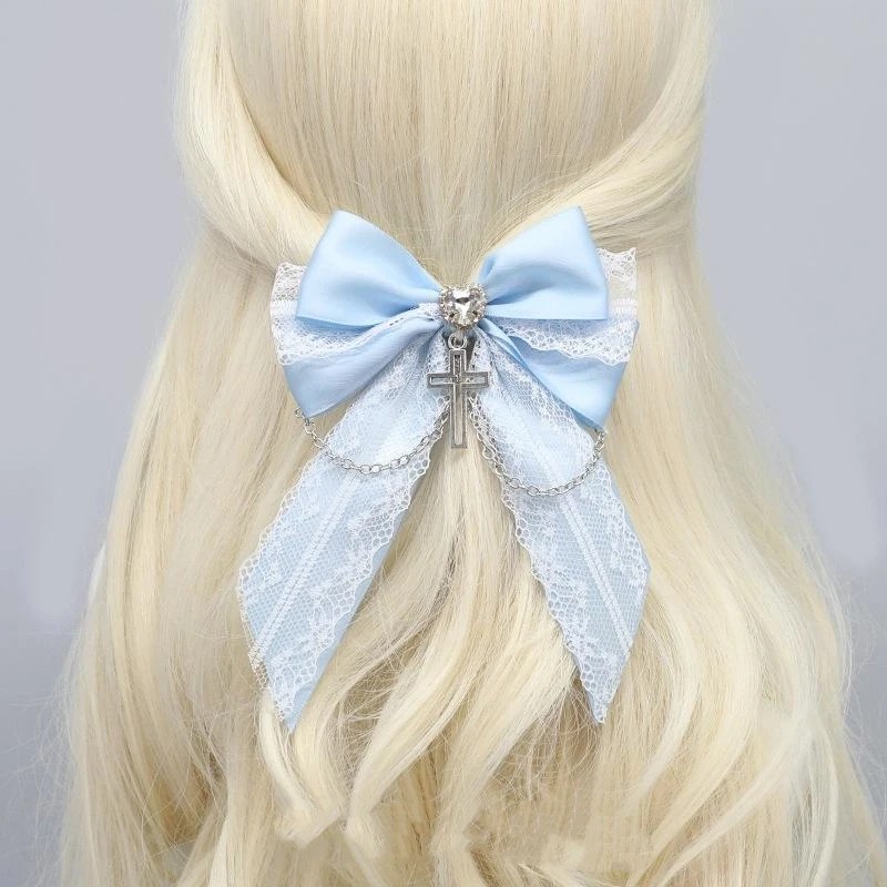 Grand nœud capillaire d'environ 15 cm Dentelle Chaîne Pendentif en métal croix Barrette en métal Décoration en tissu Accessoire capillaire élégant