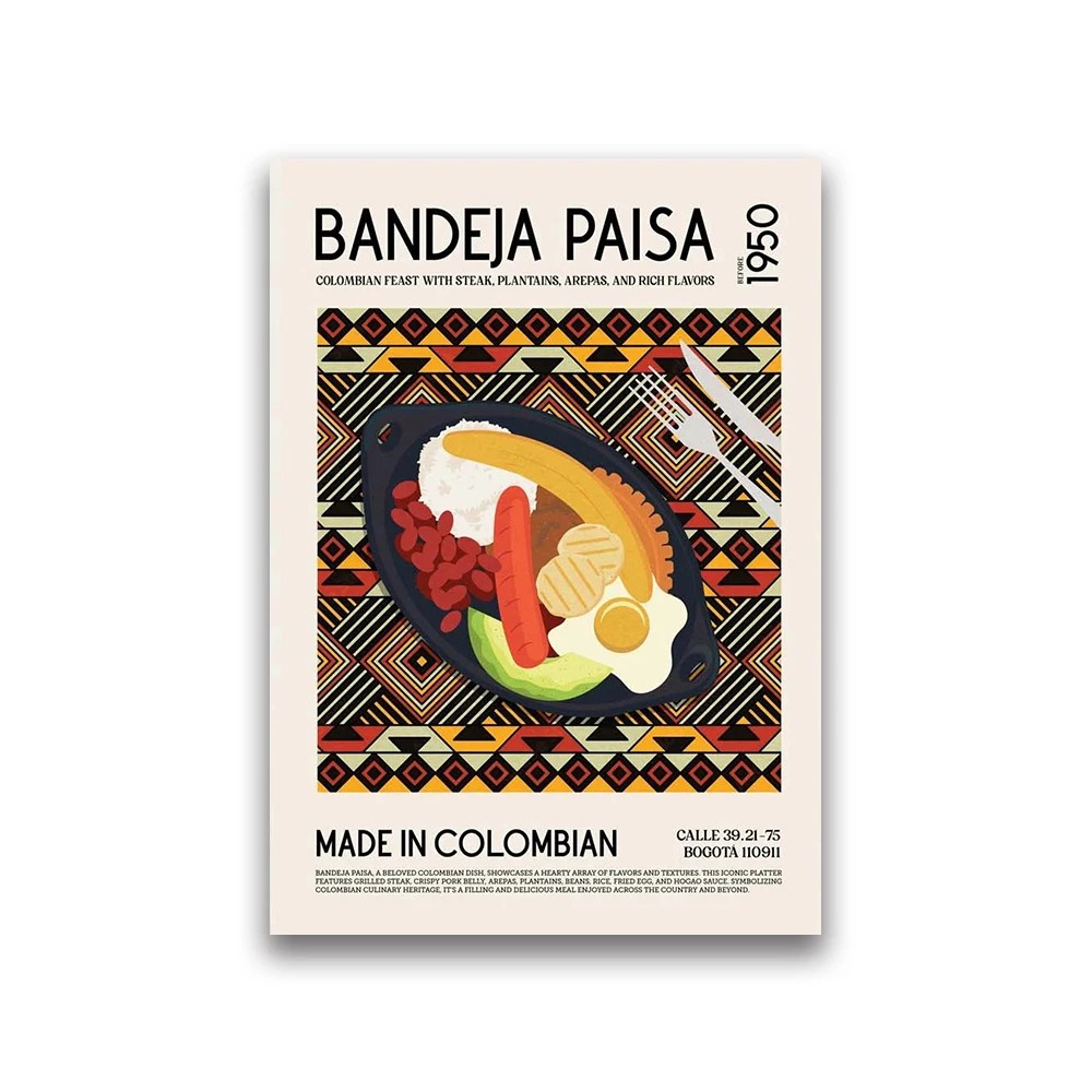 Un motif frappant de la Bandeja Paisa colombienne apportera une atmosphère authentique de la gastronomie mondiale à votre cuisine ou restaurant. Description complète