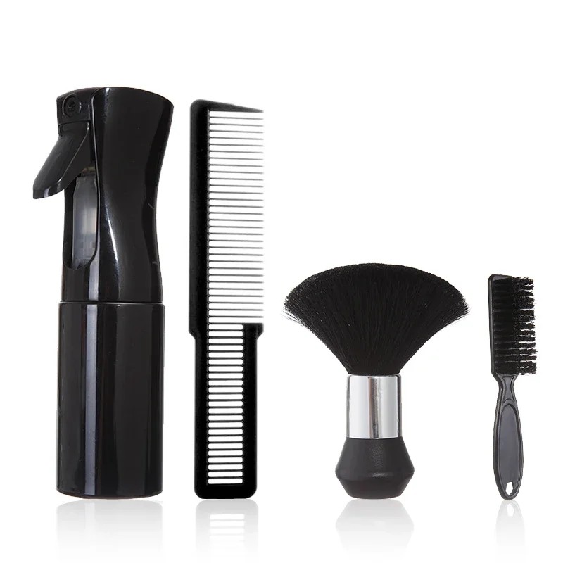 Kit de barbier professionnel 4 en 1 Spray 19 x 5,5 cm Peigne 20,2 x 4 cm Brosse de nettoyage 14 x 9,5 cm Brosse 14,5 x 2,7 cm