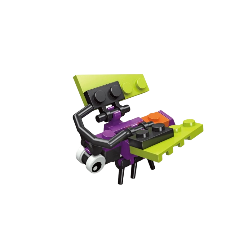Avec un total de 23 pièces, l'assemblage est rapide et clair, ce qui rend le kit adapté aussi bien aux débutants qu'aux créateurs plus expérimentés. Le corps est constitué d'une combinaison de pièces violettes et noires, tandis que des „ailes“ ou plaques vert clair sont placées sur les côtés, donnant à la figurine une silhouette plus longue. Les pattes noires et fines évoquent une impression de légèreté et de grande mobilité, caractéristiques des mantes religieuses. Grâce à sa stylisation, la figurine semble être un mélange d'insecte réel et de personnage de dessin animé.