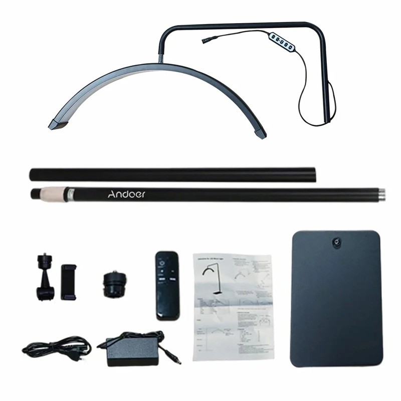 Contenu de l'emballage : lumière LED, trépied, socle de lumière, support de téléphone, adaptateur d'alimentation, câble d'alimentation, télécommande, manuel d'utilisation.
