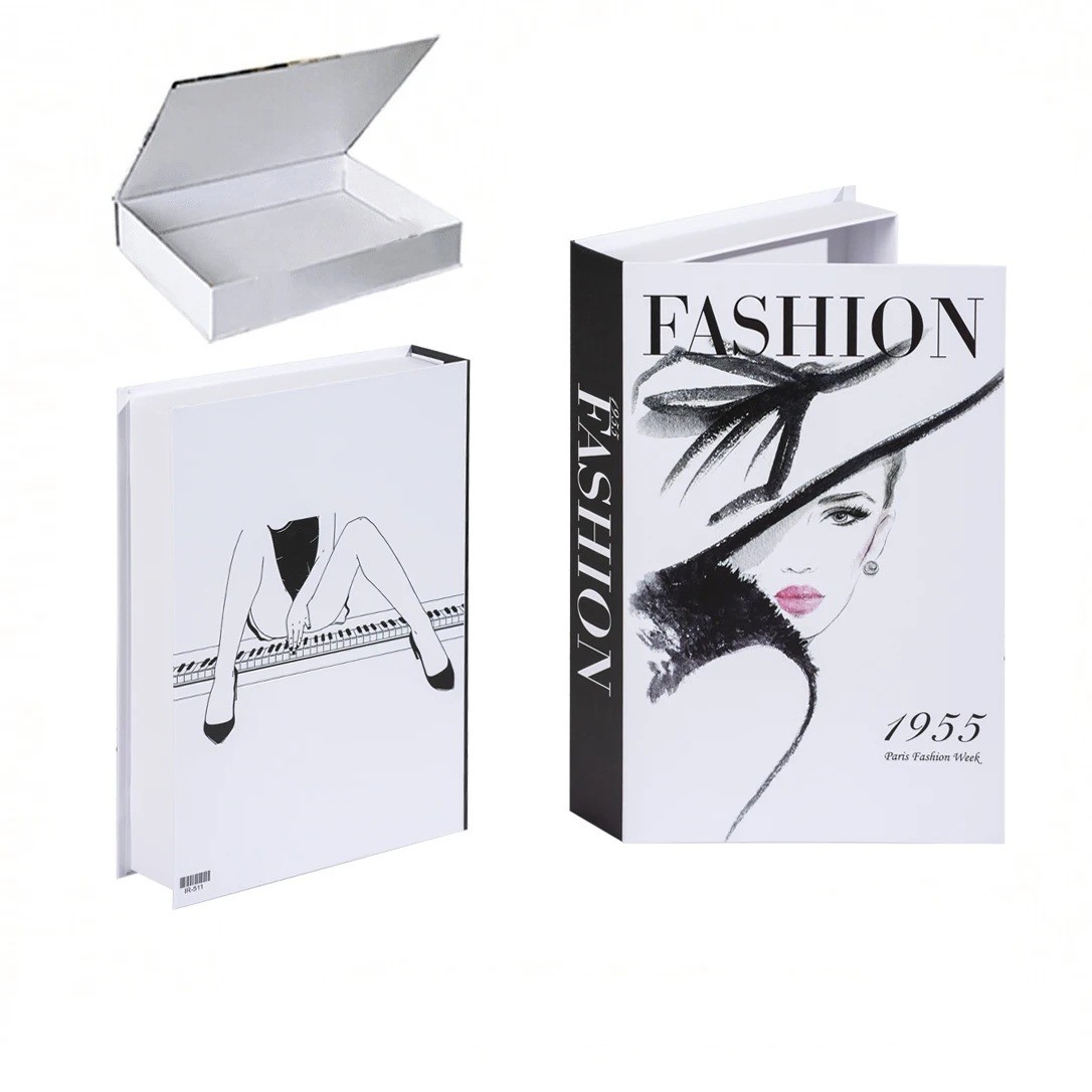 Livre factice avec espace de rangement, décoration ouvrable avec motif de la semaine de la mode à Paris de 1955. Couverture noir et blanc avec illustration pour les amateurs de mode et de style. Description complète