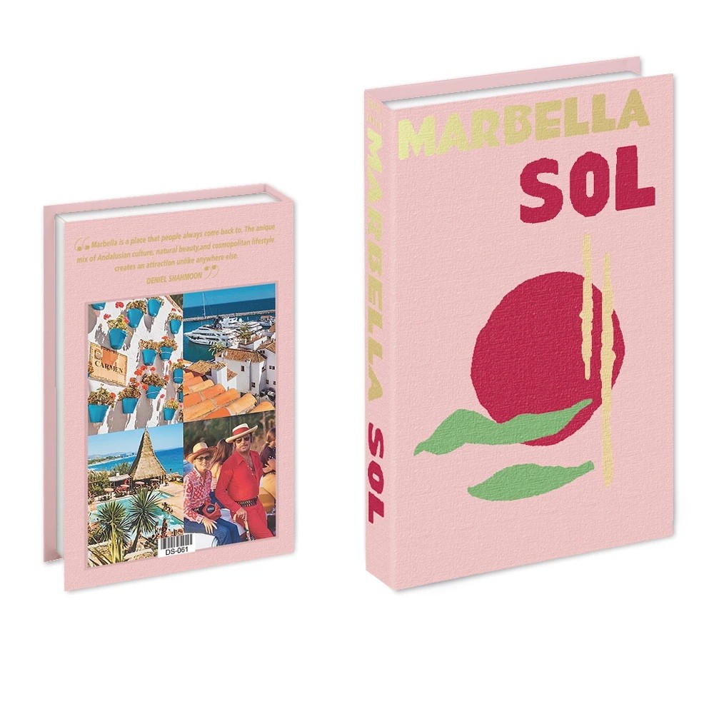 Livre faux stylé avec motif "Marbella Sol", design ouvrable et espace de rangement pratique pour les petites affaires. Idéal comme décoration pour les amateurs de destinations ensoleillées et de plages européennes. Description complète