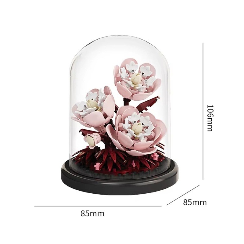 Luxueuse micro construction de pivoines 85 x 85 x 106 mm 168 pièces Modèle floral dans un pot dans une boîte transparente Élégante décoration et cadeau créatif pour enfants et adultes