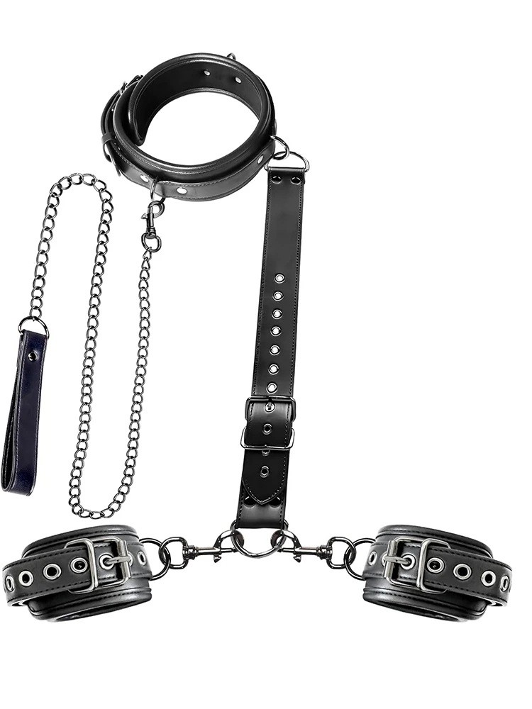 Cet ensemble BDSM exclusif allie élégance et fonctionnalité. La base du système est un collier en chaîne en métal massif, qui se fixe autour du cou. Il est suivi d'une sangle en cuir le long de la colonne vertébrale, qui relie deux menottes pour les poignets. Les menottes sont conçues pour que les mains pendent librement le long du corps, ce qui entraîne une limitation naturelle des mouvements sans tension excessive dans les épaules.