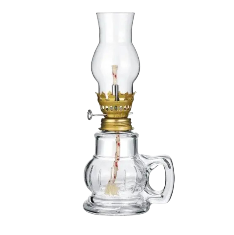 La lampe présente une construction classique rappelant une lampe à pétrole, qui se compose d'une base en verre et d'un tube en verre. Ce type de construction est courant pour les lampes à huile décoratives. Grâce à sa taille compacte, il est possible de placer la lampe sur une table, une étagère ou toute autre surface plane.