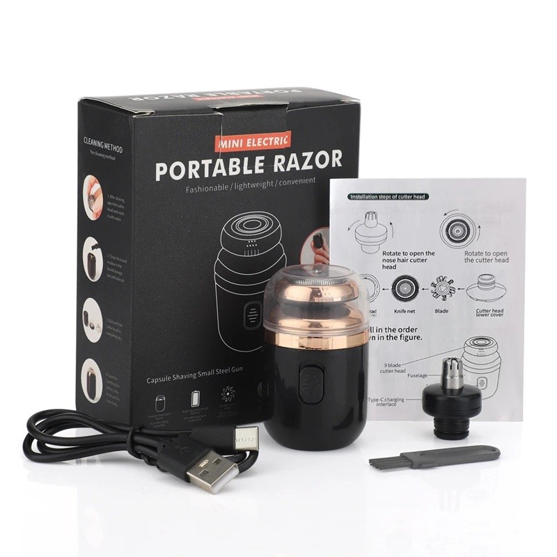 Rasoir électrique compact avec chargement USB-C, adapté pour les voyages et un usage quotidien. Conception lavable et entretien facile. Description complète