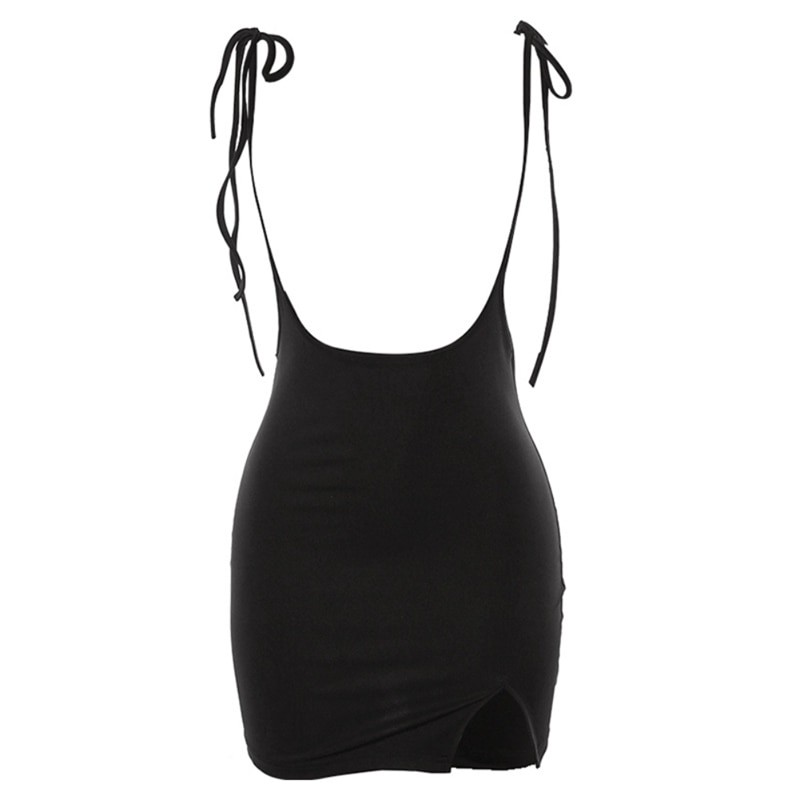 Robes noires originales mini sous la poitrine avec des bretelles à nouer.
