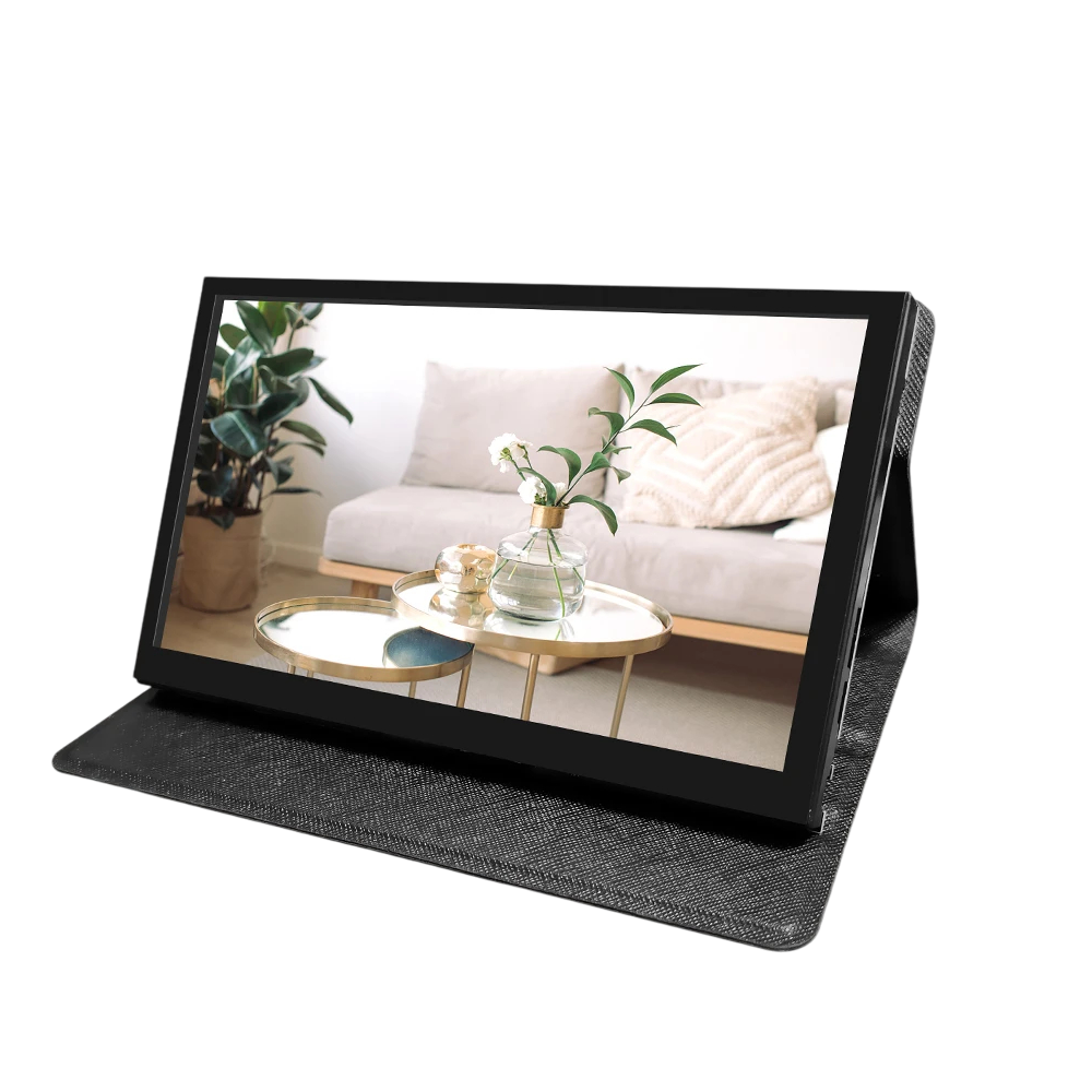 Un étui de protection avec support intégré est inclus, permettant de placer facilement le moniteur sur une table tout en protégeant l'écran lors du transport. Le moniteur ne dispose pas de haut-parleurs intégrés, mais grâce à la sortie 3,5 mm, il est facile de connecter des appareils audio externes.
