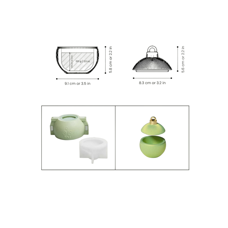 Ce moule en silicone avec un design strié moderne est idéal pour fabriquer des bougies, des savons ou des décorations de Noël. Le produit fini apparaît comme une élégante boule de Noël avec des lignes délicates, complétée par un couvercle amovible avec prise décorative, lui conférant un aspect authentique. Grâce à son traitement détaillé, le moule est adapté à la création de décorations luxueuses et de cadeaux originaux.