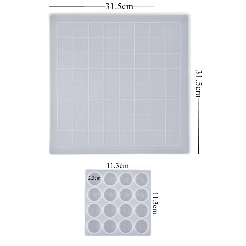 Le moule est fabriqué en silicone de haute qualité, qui est flexible, résistant et permet un démoulage facile des pièces finies. Le plateau de dimensions 31,5 x 31,5 cm est divisé en cases régulières et complété par un moule pour couler les pièces d'échecs. Cet ensemble vous permettra de créer un jeu d'échecs unique, que vous pourrez personnaliser en couleur et en design selon votre propre imagination.