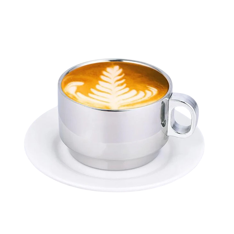 Mug en acier inoxydable bas avec anse et double paroi 300 ml en acier inoxydable de couleur argentée pour boire du café et du thé à la maison