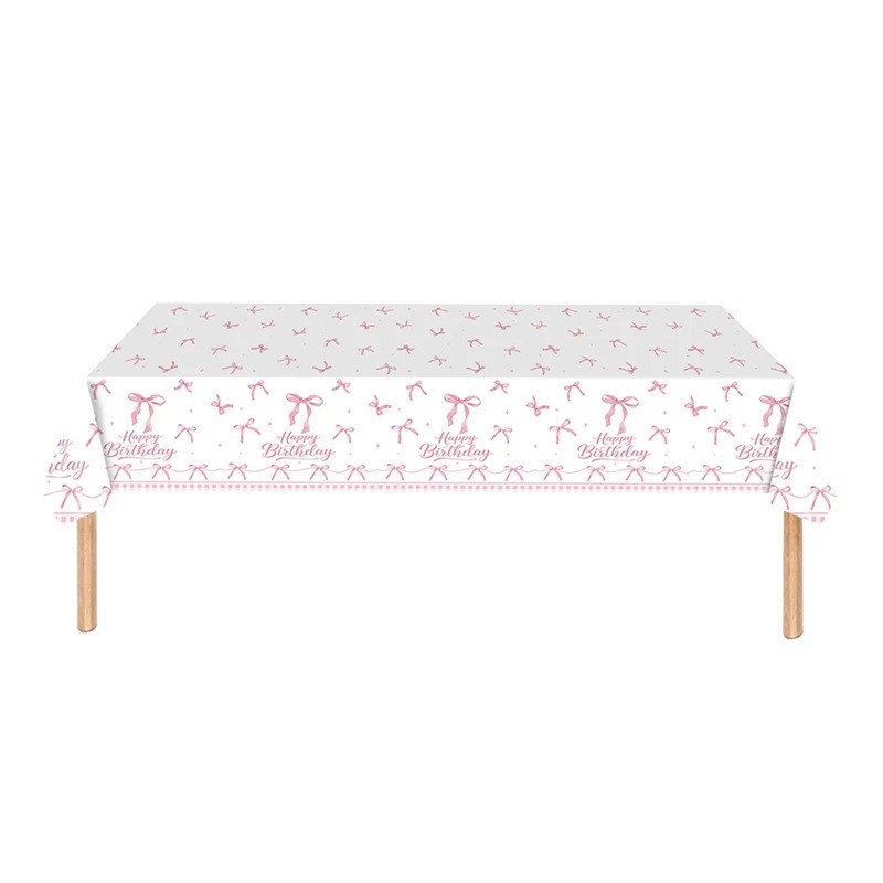 Nappe de table 137 x 274 cm Joyeux Anniversaire Noeuds Roses Nappe de fête à usage unique Décoration de table pour célébration