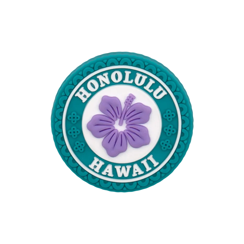 Ornement pour chaussures crocs au motif Honolulu Hawaii est un accessoire pratique qui permet d'adapter l'apparence des chaussures selon son propre style. Le design est constitué d'une forme circulaire avec un texte prononcé et un motif floral dominant au centre. La fleur violette est complétée par une bordure verte et un fond blanc, créant un aspect contrasté et bien visible. Ce motif est inspiré par un environnement tropical et est facilement reconnaissable. Le matériau PVC assure la solidité et la conservation à long terme de la forme.