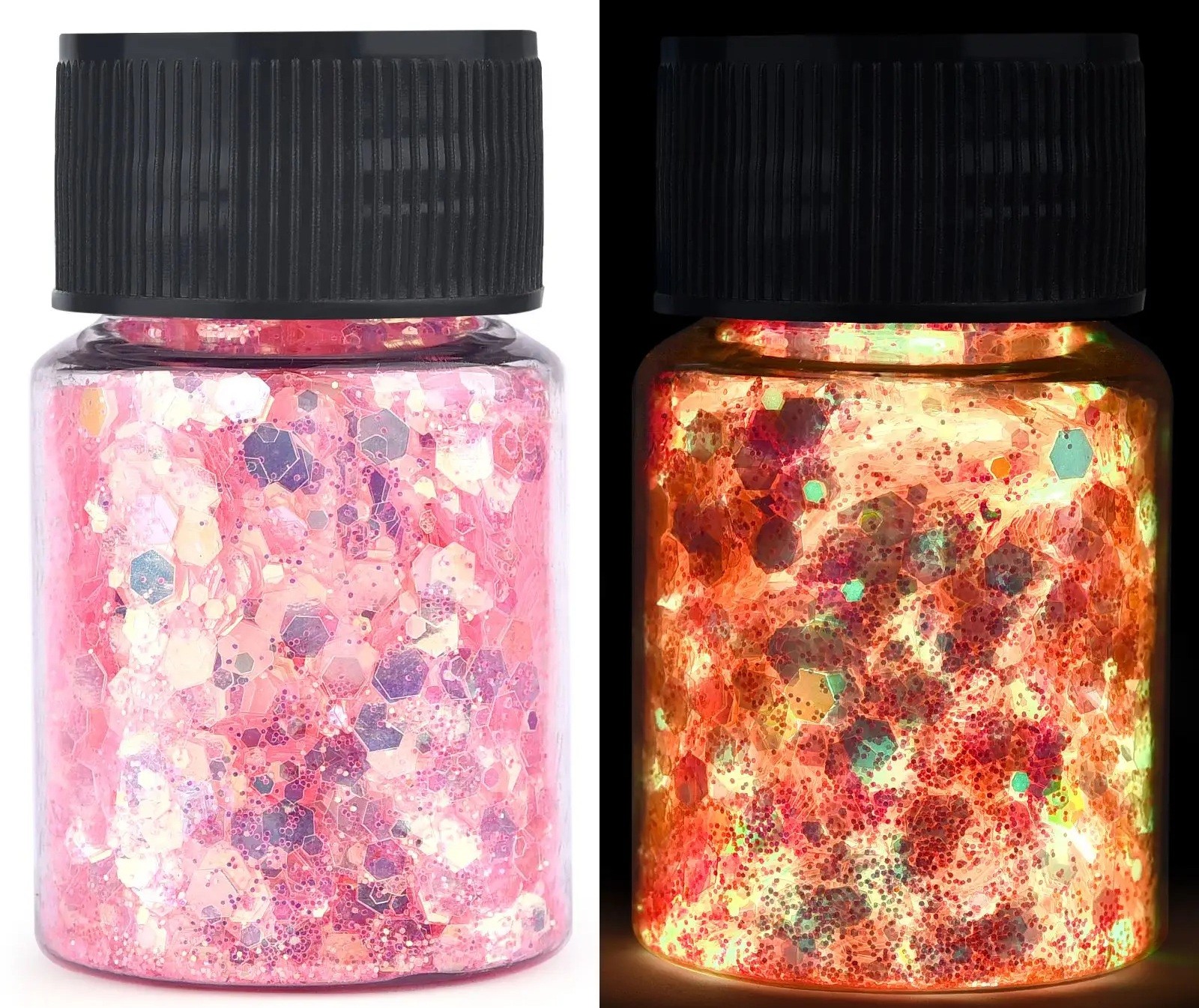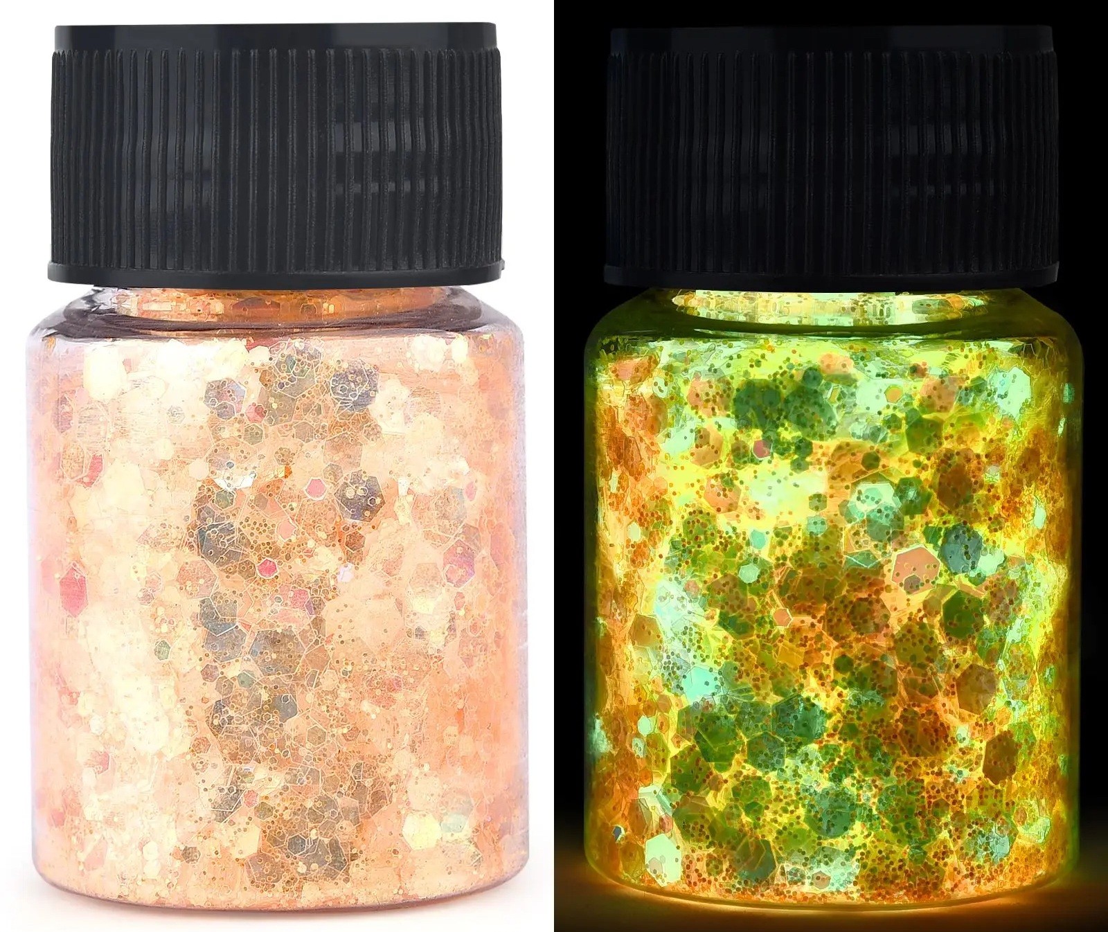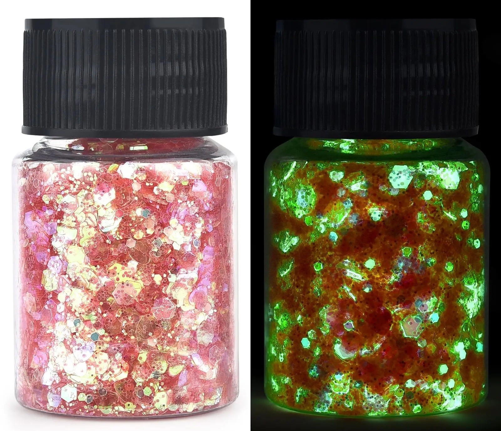 • Les paillettes réagissent à la lumière UV et brillent dans l'obscurité