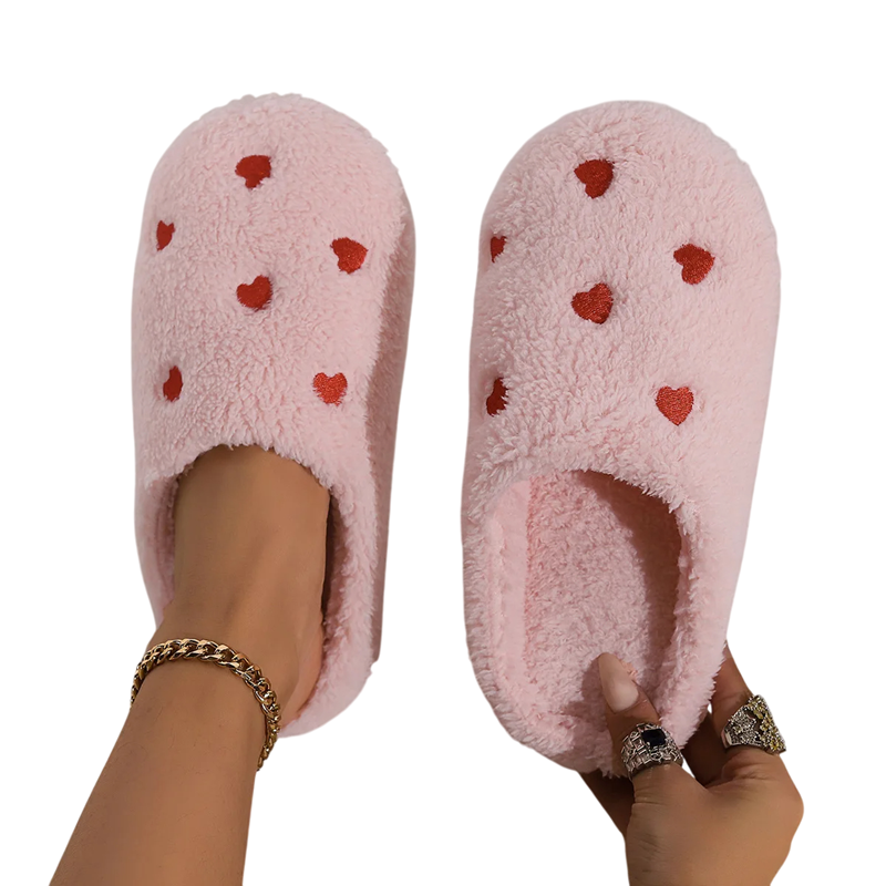 Pantoufles d'hiver pour femmes avec des cœurs Chaussons doux et pelucheux pour un usage domestique Chaussons chauds pour l'hiver Pantoufles confortables avec un motif mignon