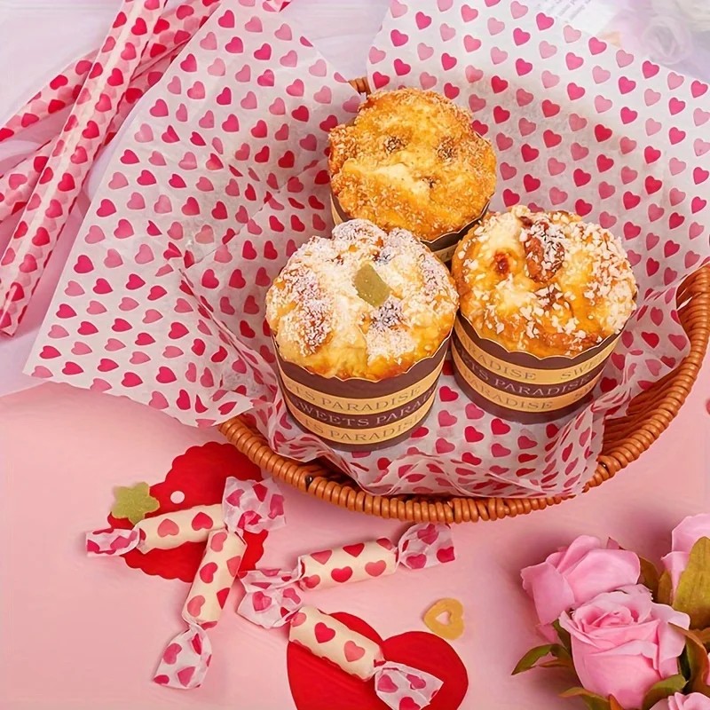 Papier ciré 21,5 x 25 cm 50 pcs Motif cœurs Papier d'emballage anti-graisse pour pain Desserts et sandwiches Papier d'emballage pour la cuisine