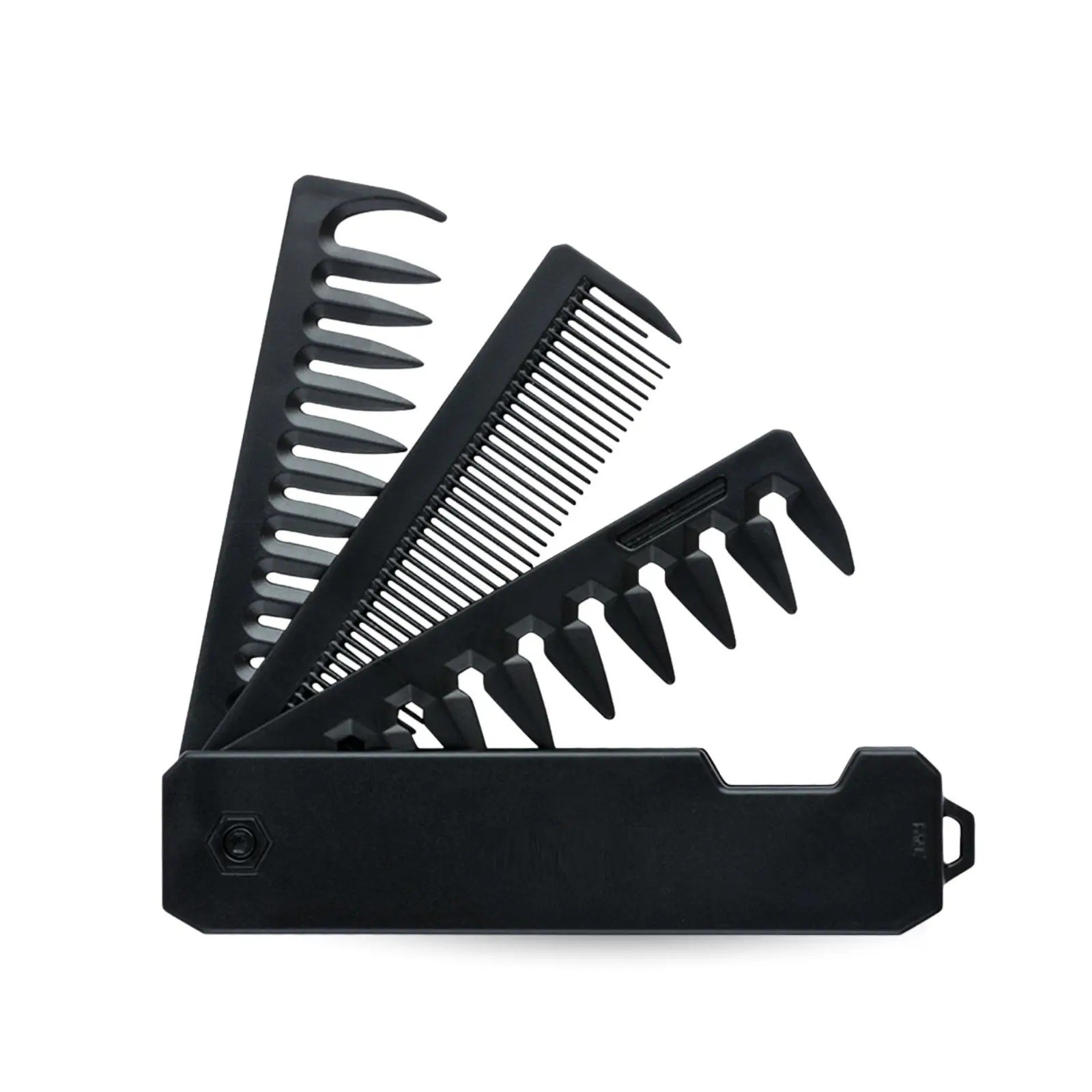 Ce peigne pliable multifonction est conçu comme un outil pratique pour le coiffage des cheveux et de la barbe à tout moment de la journée. Dans son corps compact, vous trouverez quatre types de dents : denses pour un peignage précis, larges pour un démêlage facile, de stylisation pour le coiffage et une dent raccourcie pour séparer facilement les mèches. Cela en fait un accessoire polyvalent que vous pouvez utiliser à la maison comme en voyage.