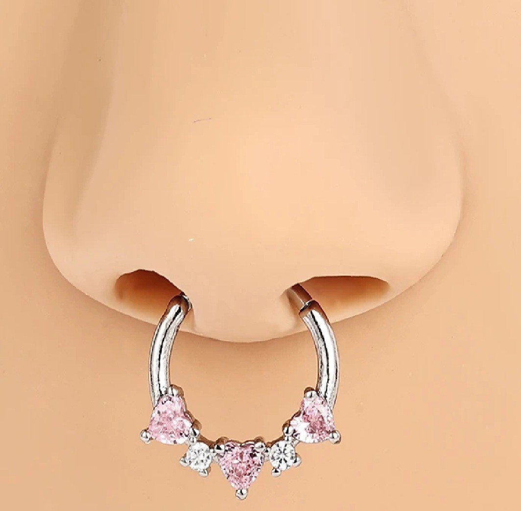 Le piercing rond avec trois cœurs roses et des détails argentés a une apparence délicate et ludique, idéal comme accessoire stylé pour un usage quotidien. Description complète