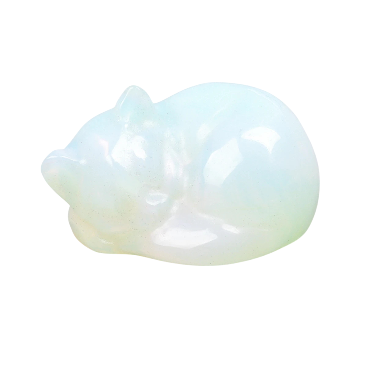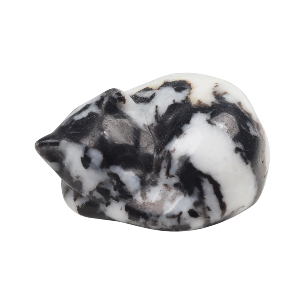 La pierre minérale sculptée en forme de chat représente une petite figurine décorative en matériau naturel. Cette pierre est travaillée sous la forme d'un chat couché avec une surface lisse et des formes délicatement arrondies. Sa taille d'environ 4 cm permet un placement facile sur diverses surfaces.