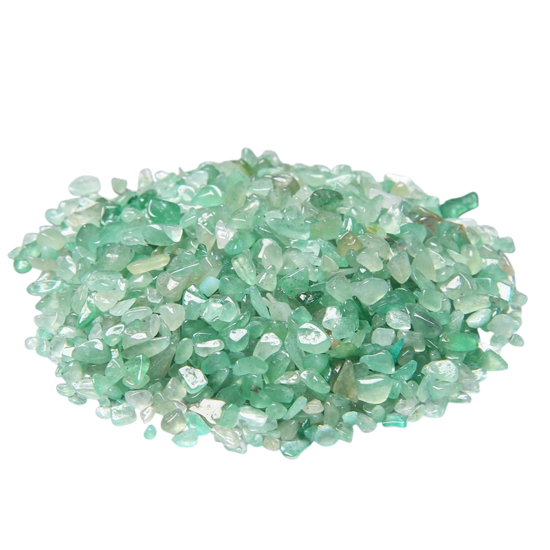 Pierres vertes d'aventurine en matériau naturel de taille 3–5 mm. Emballage de 20 g adapté pour décorations, créations et travail avec des minéraux. Description complète